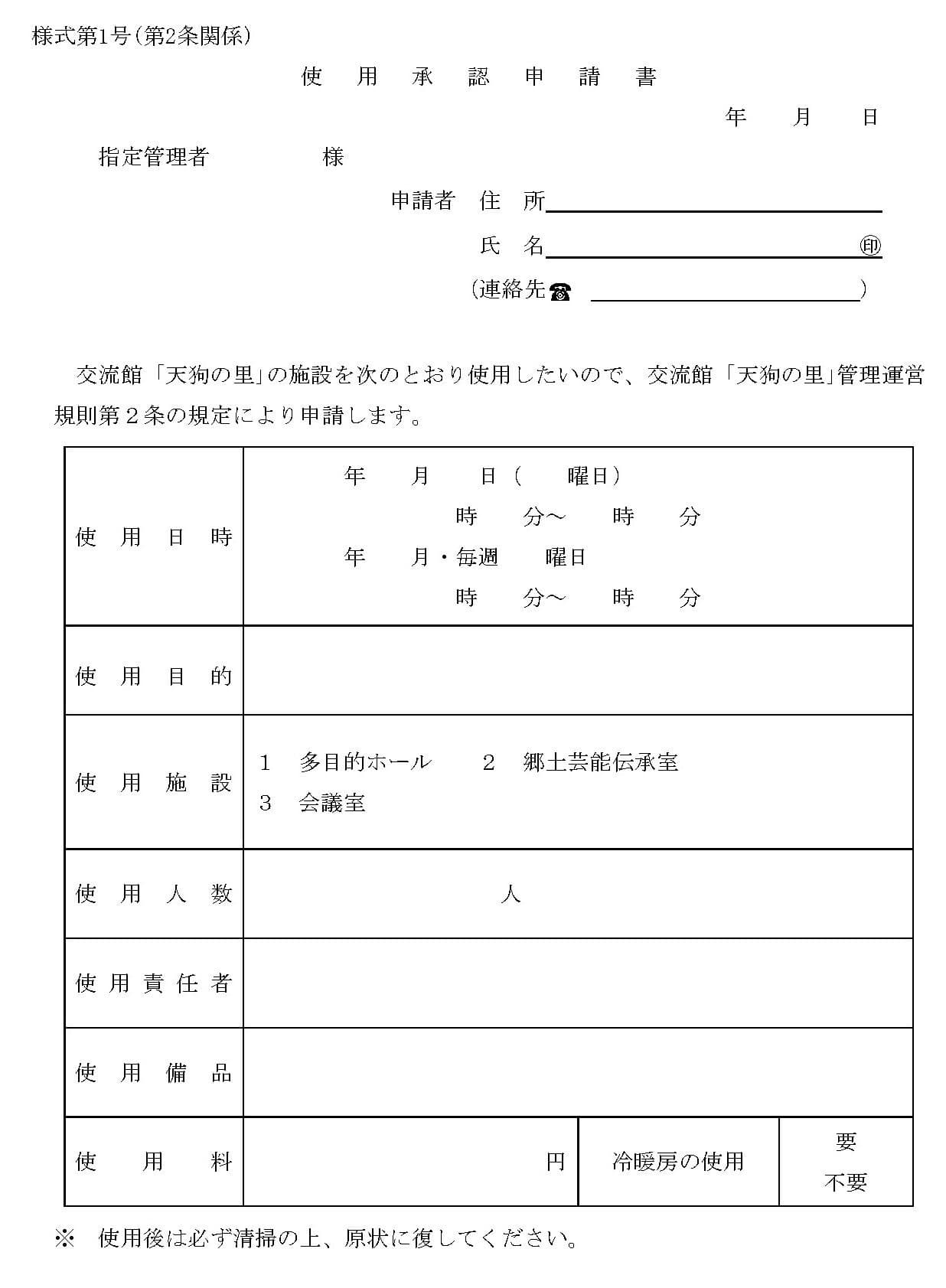 ■交流館施設紹介 外観 玄関 利用例-神楽 利用例-会議 利用例-神楽 利用例-神楽 利用例-神楽 利用例-神楽 利用例-神楽 ■使用料金 区 分 使用料金/1時間 冷暖房料/1時間 多目的ホール(体育館) 1,000円 - 会議室 100円 100円 郷土芸能伝承室(ステージ) 300円 100円 ■申請書 個々の有料施設及び附属設備毎に、料金を記入してください。お申し込みは、FAX.0826-82-3234 申請書wordファイル 申請書PDFファイル 田原自治会 〒731-2105 広島県山県郡北広島町田原647番地1 Tel&Fax.0826-82-3234 スマホ用QRコード
